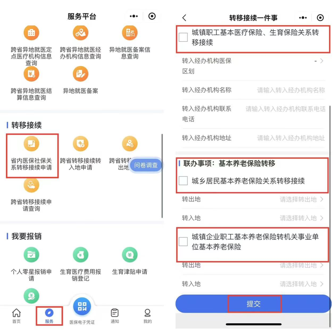 2.省内办理:进入“服务”页面,选择“省内医保社保关系转移接续申请”,按提示勾选事项并提交。