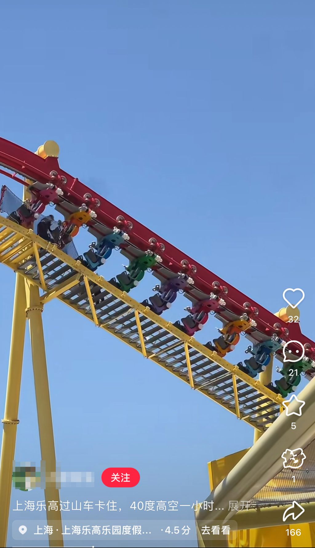 6月28日,有网友在社交媒体上发帖说,当日乐高大飞车卡住了,游客最后是自己从黄色梯子上走下来的。