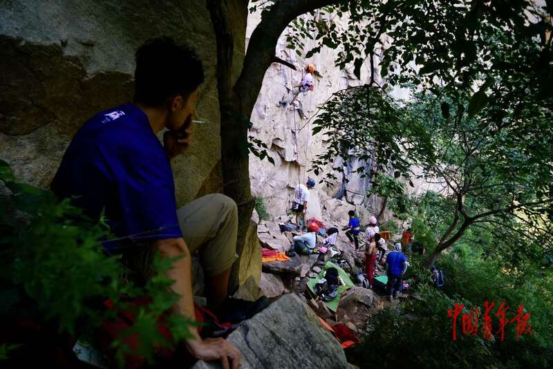 6月22日,北京密云,京郊一处岩壁吸引了数十名热爱攀岩的年轻人。密云的山里有多处野外攀岩基地。早上,这群年轻人会搭乘大巴车从城里进山,傍晚再乘坐大巴车返回城里。攀岩被称为“峭壁上的芭蕾”。攀岩在2020年东京奥运会上首次被列为正式比赛项目。近年来,攀岩逐渐成为许多年轻人热爱的运动。国家体育总局登山运动管理中心数据显示,2012年全国的攀岩爱好者只有近1万人,截至2023年年底,已增长至50余万人。中青报·中青网记者 李强/摄