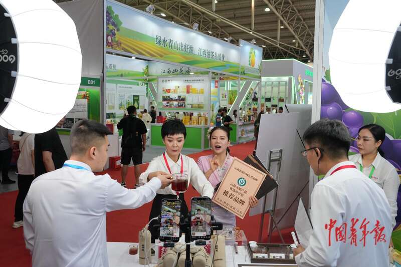 6月21日上午,北京农展馆,第三届乡村特色优势产业发展大会暨消费帮扶产品展销会上,主播在推荐一款云南茶叶。大会期间,主办方举办产销对接会,近100家大中型商超、电商平台、贸易流通相关行业协会等采购渠道和平台现场采购洽谈签约。公益专场直播带货和“益起播”直播技能培训,以及“甘味出陇”专场推介活动,将通过线上线下联动,帮助带动乡村特色产品扩大销售。中青报·中青网记者 李隽辉/摄