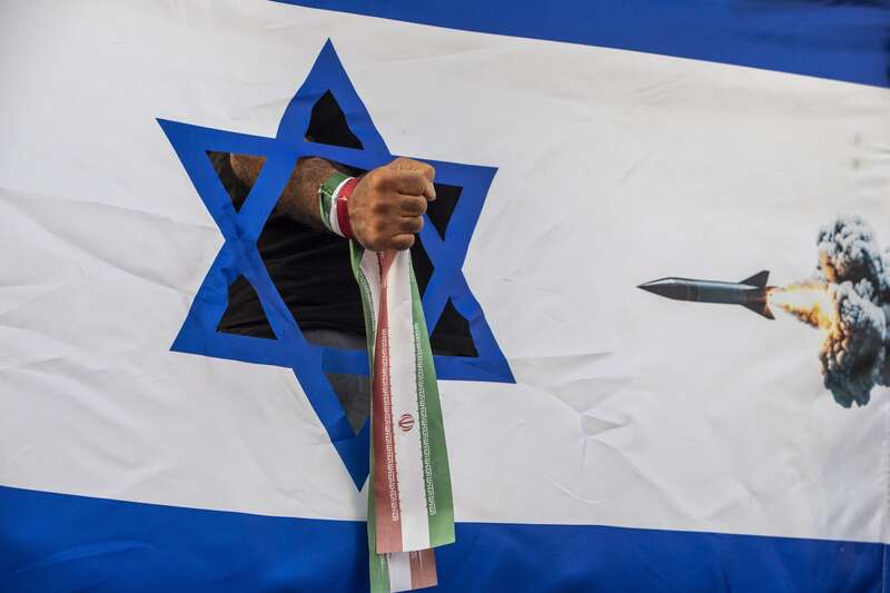 当地时间6月24日,伊朗德黑兰,一名佩戴伊朗国旗颜色腕带的人将拳头穿过印有导弹图案的以色列国旗中心。当日,伊朗当局宣布同意与以色列停火。视觉中国供图
