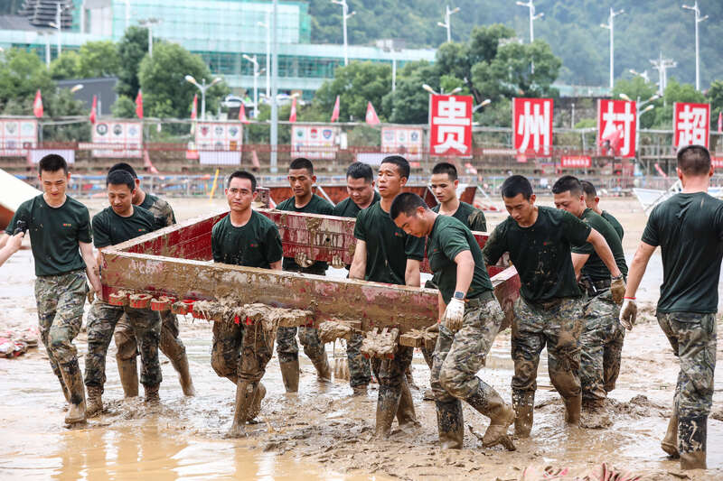 6月25日,武警贵州总队黔东南支队官兵在清理贵州“村超”球场的杂物。6月24日凌晨,受持续强降雨及上游来水叠加影响,贵州省黔东南苗族侗族自治州榕江县境内多条河流水位持续快速上涨,县城多处低洼地带被淹。险情发生后,当地迅速响应,全力开展抢险救灾工作。目前,榕江县城洪水已逐步退去,清淤清障工作有序开展,电力、供水、通讯等基础设施正抓紧抢修。视觉中国供图