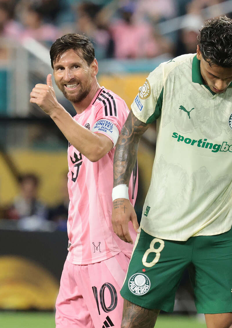 当地时间6月23日,美国迈阿密,2025FIFA世俱杯A小组最后一轮迈阿密国际队与帕尔梅拉斯队的比赛中,梅西(左)为队友的妙传点赞。比赛当天是梅西的38岁生日。刘占崑/摄