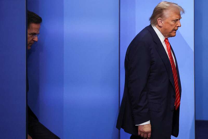 当地时间6月25日,荷兰海牙,北约峰会前,美国总统特朗普(右)与北约秘书长马克·吕特一同准备拍摄合影。北约领导人于6月24日至25日在海牙举行了为期两天的峰会。视觉中国供图