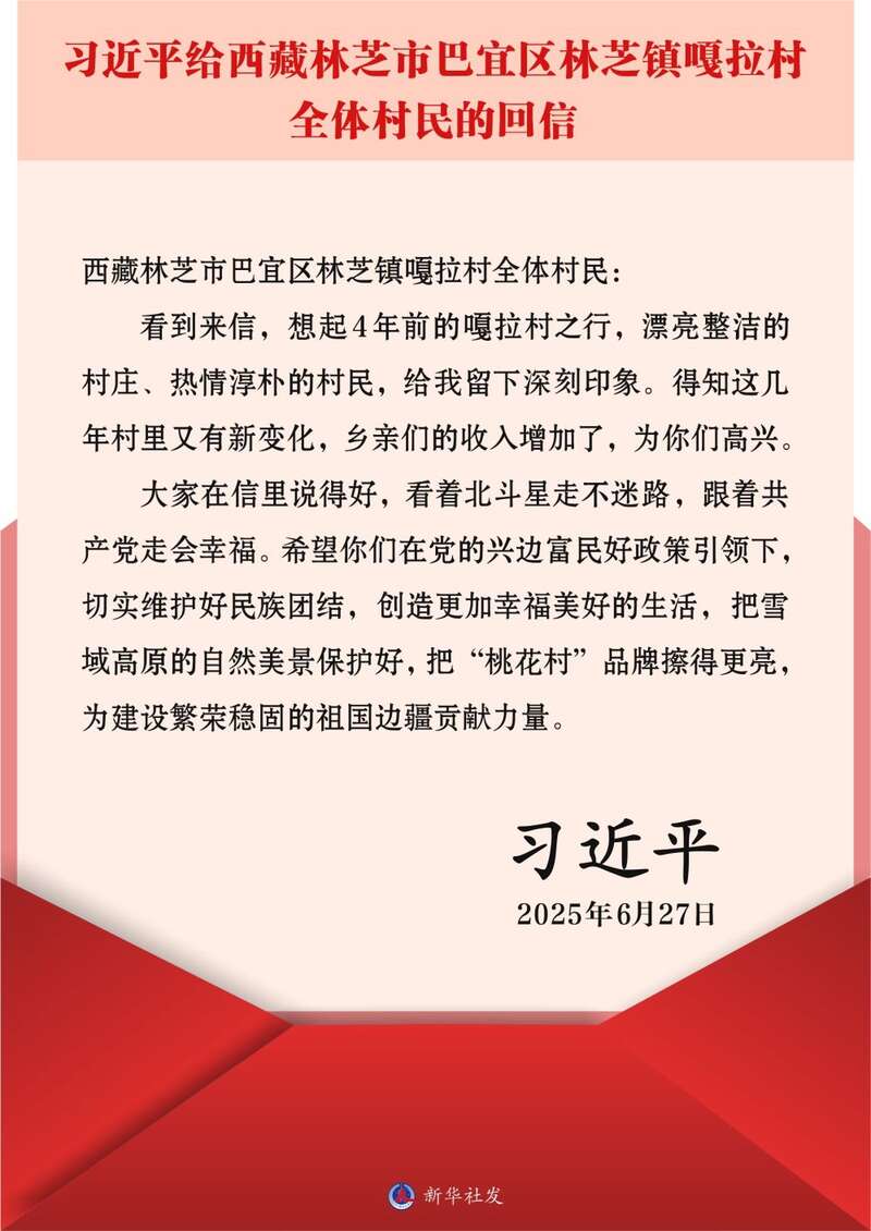 近日,中共中央总书记、国家主席、中央军委主席习近平给西藏林芝市巴宜区林芝镇嘎拉村全体村民回信,提出殷切希望。