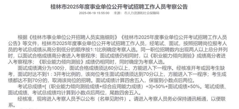 6月30日,大皖新闻记者查询桂林市人社局官网发现:6月19日,该网站发布《桂林市2025年度事业单位公开考试招聘工作人员考察公告》,共1115人进入考察人选名单。苏某某应聘的单位是桂林市平乐县同安镇便民服务中心,岗位是从事辖区内就业服务的管理宣传服务工作,属于事业编制。