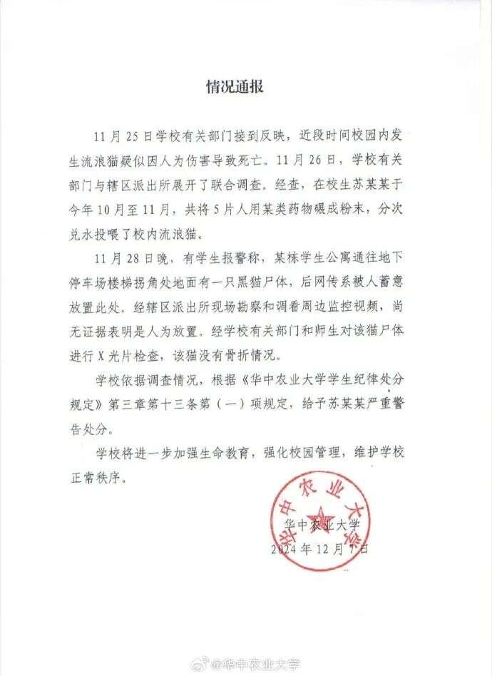 据了解,2024年12月7日,华中农业大学曾发布情况通报称,在校生苏某某于10月至11月,共将5片人用某类药物碾成粉末,分次兑水投喂了校内流浪猫。学校依规给予苏某某严重警告处分。