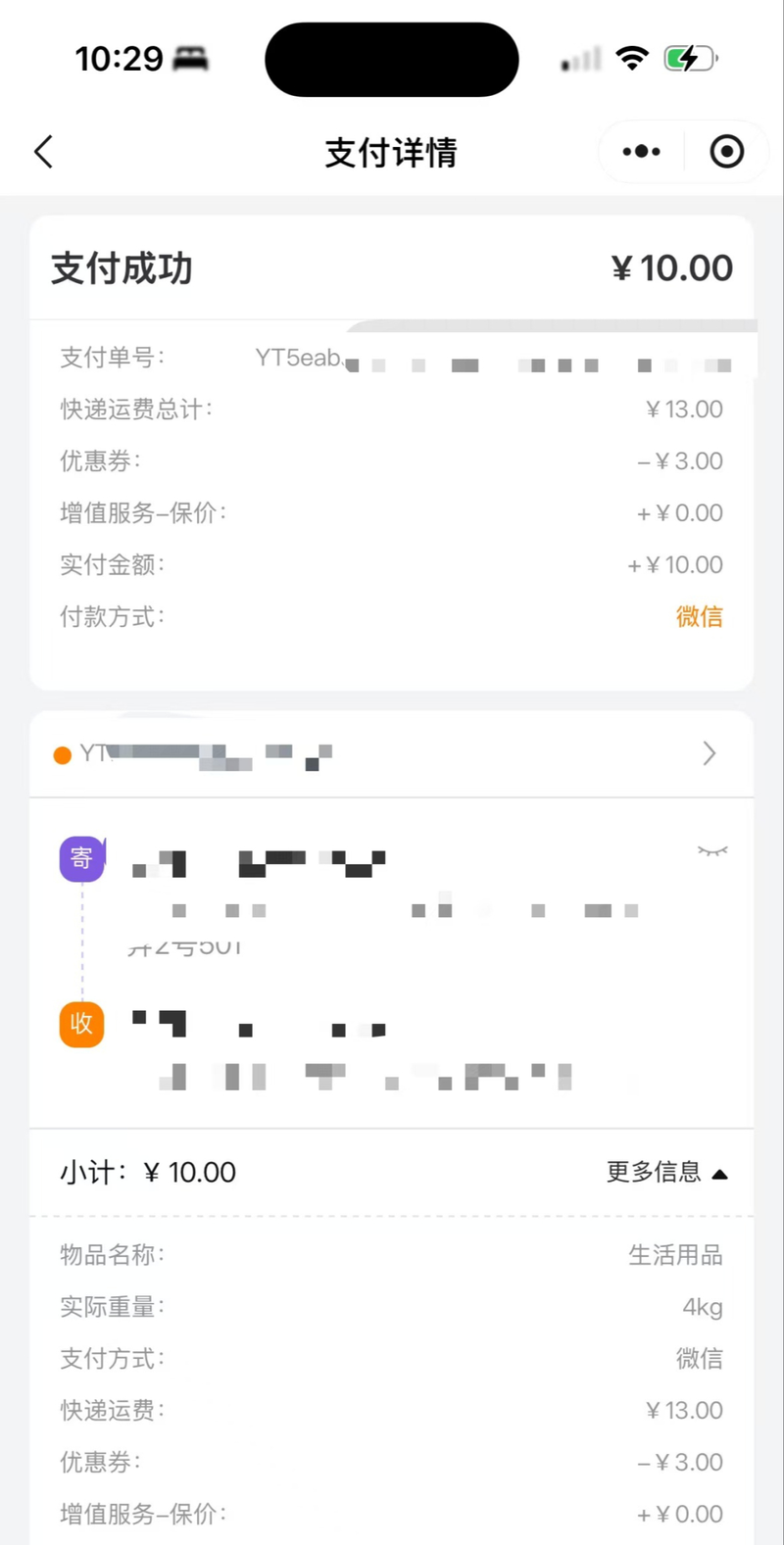 圆通的支付记录详情显示,物品实际重量为4kg,运费为13元,优惠券为3元,总费用是10元。申通的电子存单同样显示,物品信息重量为3kg,总费用为13元。