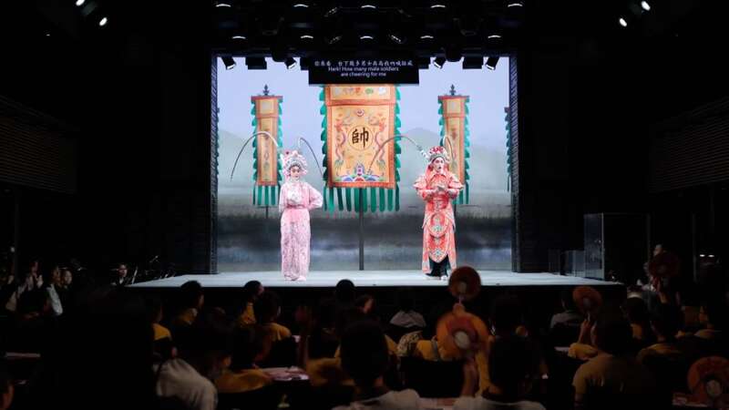 26日,一场别开生面的粤剧教育专场《粤目赏心》在香港戏曲中心茶馆剧场上演。舞台上,演奏者用高胡、扬琴等乐器演奏耳熟能详的曲目。台下,近百名师生时而哼唱,时而热烈鼓掌。