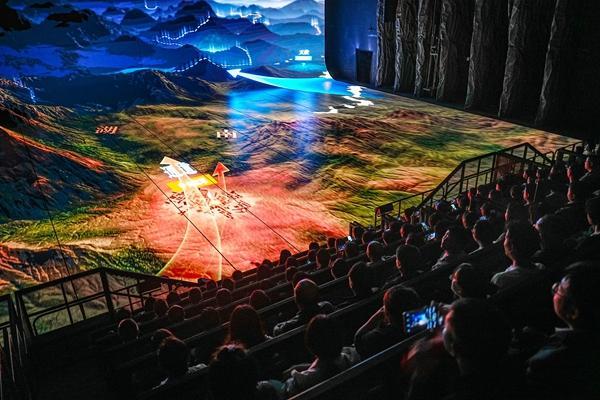 在《伟大转折》篇章中,观众置身全维度影画场馆,坐在阶梯式机械运动座椅上,眼前一块块飞行屏投影出历史场景与人物,展现遵义会议的来龙去脉。在还原“四渡赤水”“巧渡金沙江”等历史场景时,多维度屏幕展示当时的战略推演、行军路线,在机械运动座椅的起伏中体会红军渡江的惊险。