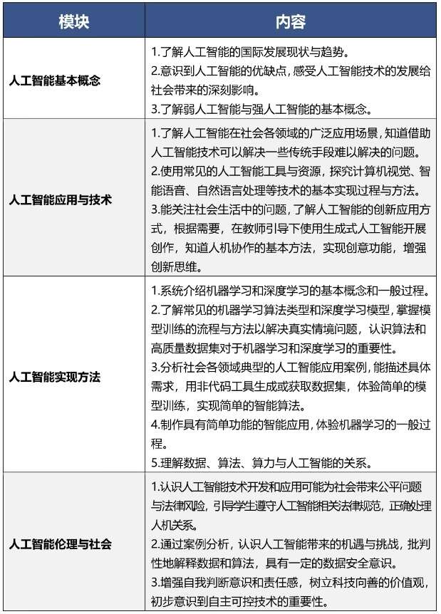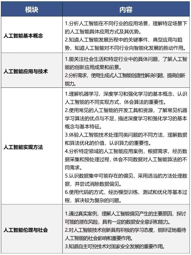 人工智能课程以全面提升学生人工智能素养为目标,面向全体学生提供人人必学、人人可学、人人愿学的基础性内容。课程包括人工智能意识与思维能力、人工智能应用与创新能力、人工智能伦理与社会责任三个方面,帮助学生从“基本了解人工智能”到“合理使用人工智能”再到“创新应用人工智能”,在人工智能项目实践中锻炼创新思维和问题解决能力。各学段将设置不同的教学目标——