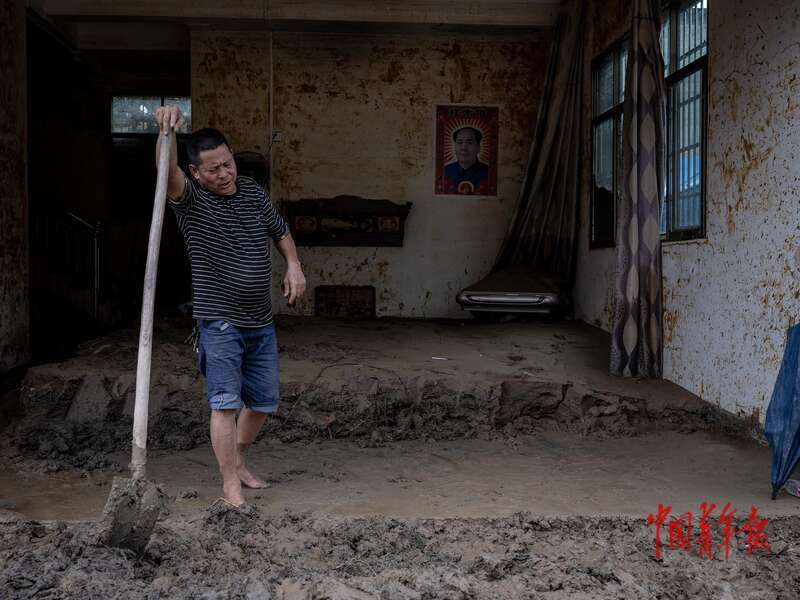 7月1日,贵州省榕江县杨家湾村,村民邰建坤在清理自家房屋的淤泥。中青报·中青网记者 李隽辉/摄