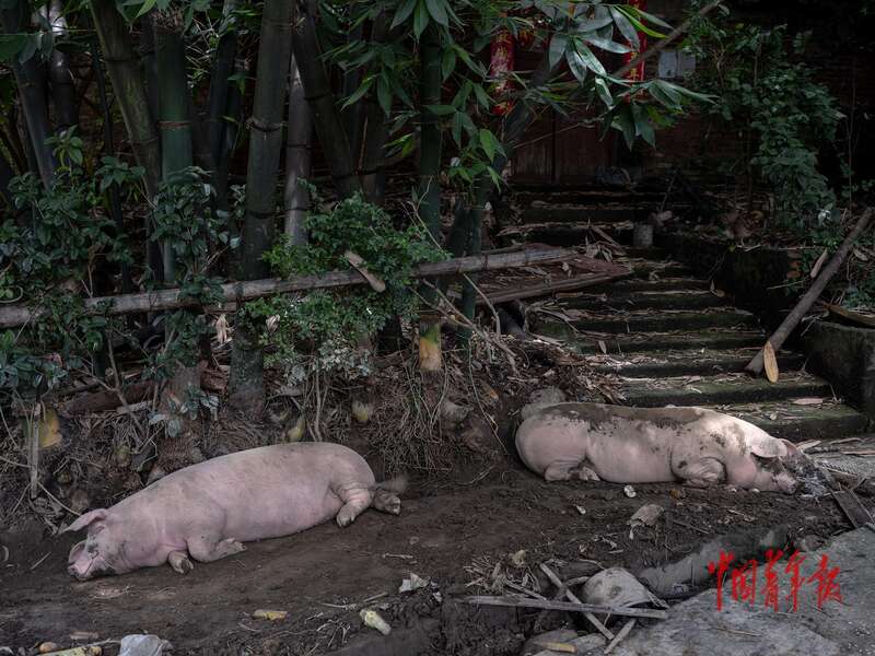 7月1日,贵州省榕江县杨家湾村,两头猪在洪灾到来时被赶到山上,幸存了下来。中青报·中青网记者 李隽辉/摄