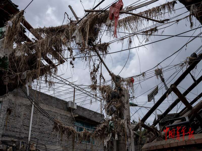 7月1日,贵州省榕江县杨家湾村,两层楼高的电线上挂着被洪水冲来的枯草和杂物。中青报·中青网记者 李隽辉/摄