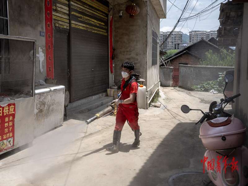 7月1日,贵州省榕江县杨家湾村,28岁的李明书抬着弥雾机在村中进行防疫消杀。中青报·中青网记者 李隽辉/摄