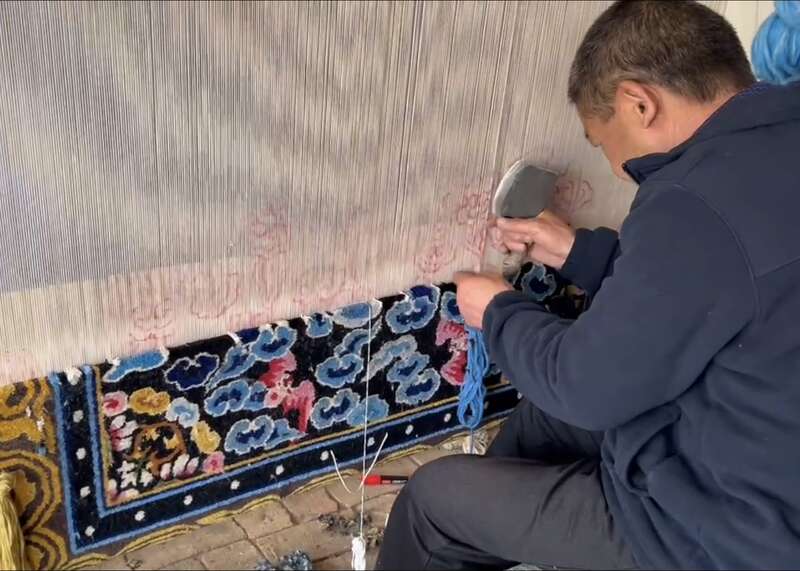杨永良正在编织的,是一名北京的客人给父亲祝寿定制的一块“洪福齐天”藏毯——16只红色的蝙蝠在靛蓝的祥云中昂首展翅,寓意“福泽绵延”。