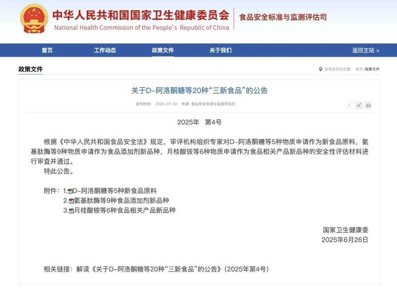 国家卫生健康委官网今天发布《关于D-阿洛酮糖等20种“三新食品”的公告》。这意味着,来自北京市昌平区微元合成生物技术(北京)有限公司生产的阿洛酮糖正式获得国家卫生健康委员会新食品原料公告行政许可,该企业成为全国首家获得批准上市的阿洛酮糖生产企业,也是唯一一家通过生物发酵工艺获批的企业。