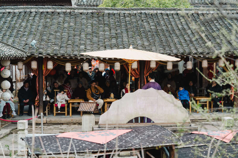 濮院是京杭大运河出嘉兴市区后第一个水乡古镇,有近千年历史,曾以“日出万匹绸”被誉为“嘉禾一巨镇”。瓦舍说书兴起于宋代的瓦舍勾栏中,类似于现在的说书表演,讲述的内容为传奇、历史故事等,充满江南风情。