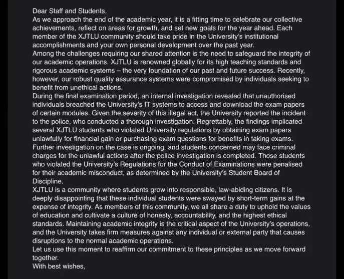 同时,有该校学生表示收到了疑似关于此事的内部邮件通知:“在期末考试期间,一项内部调查显示,未经授权的个人入侵了大学的IT系统,以访问和下载某些模块的试卷。鉴于这一非法行为的严重性,大学向警方报告了这一事件,警方进行了彻底的调查。”