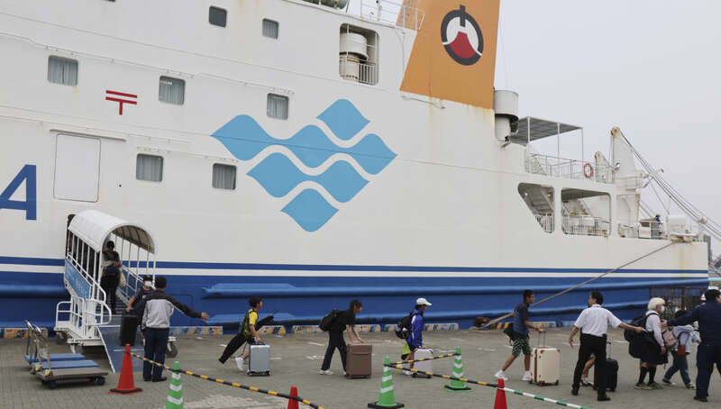 7月4日,日本鹿儿岛县鹿儿岛市,来自恶石岛的疏散人员在鹿儿岛主港南码头渡轮总站下船。日本鹿儿岛县吐噶喇列岛近海自2025年6月21日起持续发生频繁地震,截至7月2日累计记录有感地震911次。当地时间7月3日下午,吐噶喇列岛附近海域再度发生地震,鹿儿岛县十岛村恶石岛观测到6弱的地震强度。疏散人员计划在鹿儿岛市的酒店及其他住所停留一周。视觉中国供图