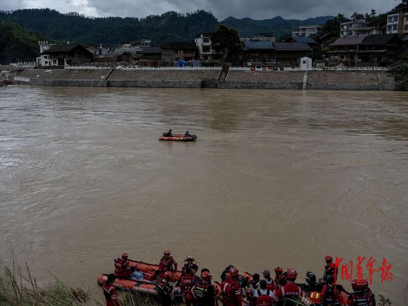 7月1日,贵州省榕江县古州镇,救援队员在临时码头乘坐皮划艇前往对岸的杨家湾村。杨家湾村荣誉村长杨秀权介绍,在两次泄洪中,该村有七成以上民居被冲毁、浸泡,村中140多户居民多为老人和留守儿童。首次泄洪后,出村的唯一一座公路桥被洪水淹没,村民与外界失去了交通联系,成了一座江中“孤岛”。受灾村民依靠住在高处的村民家里的食物,坚持到了救援队的到来。中青报·中青网记者 李隽辉/摄