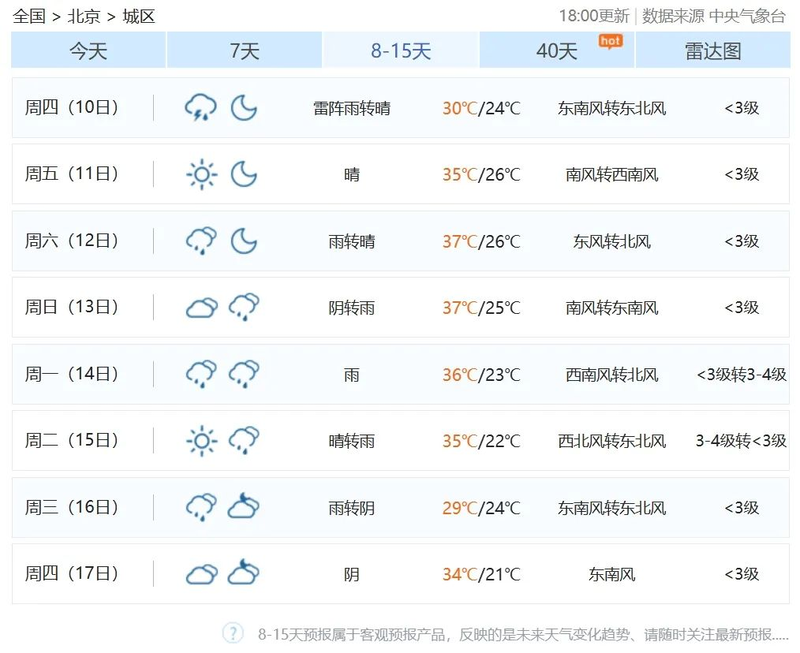 据中国天气网预报,7月4日至17日的14天中,北京有12天有降雨。7月12、13日,最高气温可达37℃……