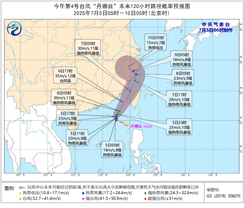 大风预报:7月5日08时至6日08时,南海东部和南部、台湾海峡南部、巴士海峡西部、广东东部沿海、福建南部沿海、台湾岛南部沿海将有7-9级大风,“丹娜丝”中心经过的附近海域风力可达10-12级、阵风13级。