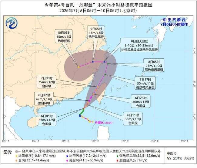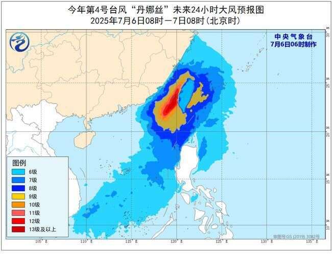 大风预报:7月6日08时至7日08时,南海东部和南部的部分海域、台湾海峡、台湾以东洋面、巴士海峡、东海西南部、广东东部沿海、福建沿海、浙江沿海、台湾岛沿海将有6~8级大风,阵风9~10级,其中南海东北部、东海西南部的部分海域、台湾海峡、台湾以东洋面、巴士海峡西部、台湾岛沿海的风力有9~11级,阵风12~13级,“丹娜丝”中心经过的附近海域或地区风力可达12~14级、阵风15级。