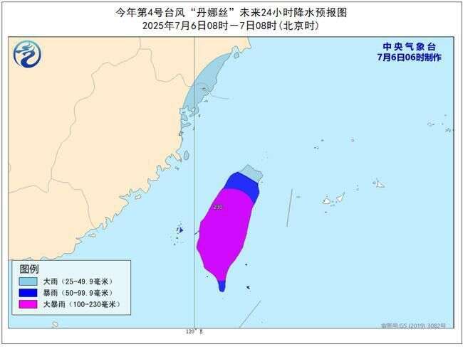降水预报:7月6日08时至7日08时,浙江东南部、福建东北部、台湾岛等地有大到暴雨,其中,台湾岛中南部的部分地区有大暴雨(100~230毫米)。