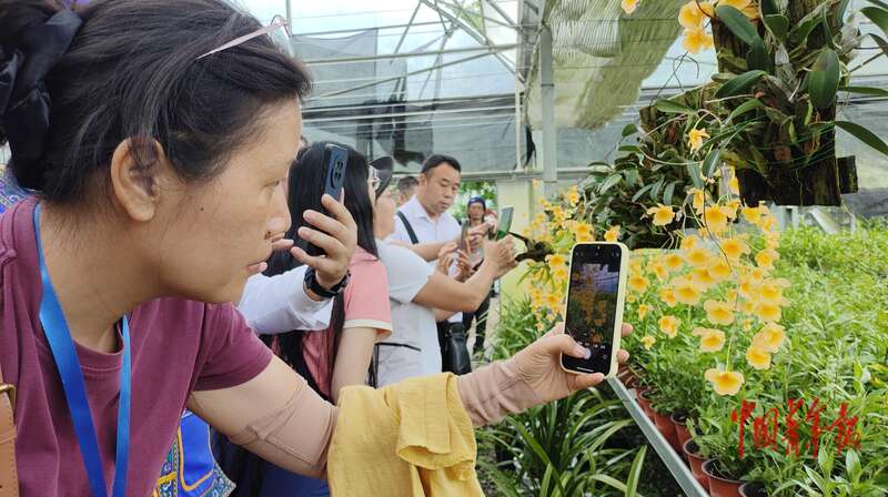 7月3日,广西百色,参加“天赐乐业·韵流寿乡”采风创作活动的诗人在广西雅长保护区管理局兰花科普园珍稀兰花展区拍摄聚石斛。中青报·中青网记者 谢洋/摄