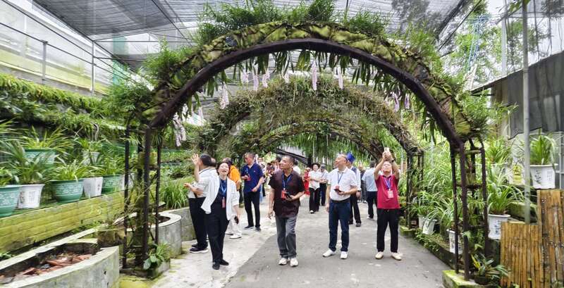 7月3日,广西百色,参加“天赐乐业·韵流寿乡”采风创作活动的诗人来到雅长保护区管理局兰花科普园珍稀兰花展区参观。刘广铭/摄