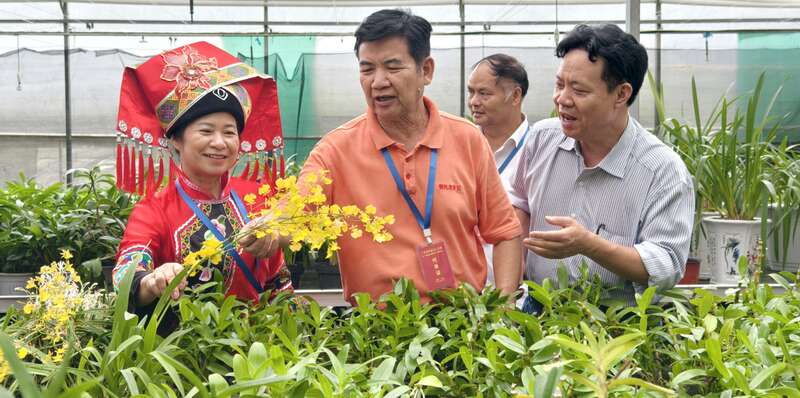 7月3日,广西百色,参加“天赐乐业·韵流寿乡”采风创作活动的诗人在雅长保护区管理局兰花科普园珍稀兰花展区参观。刘广铭/摄