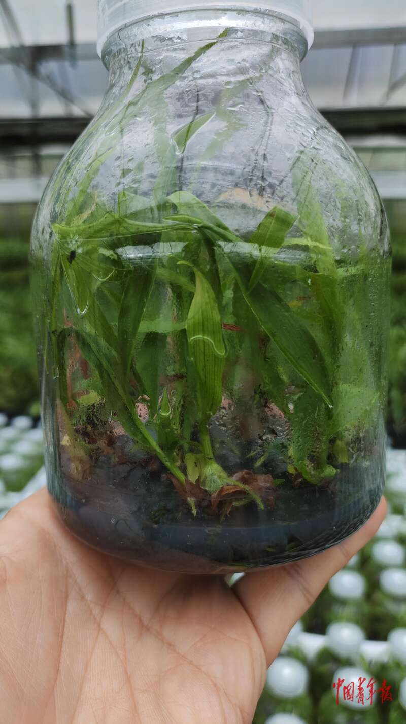 7月3日,广西百色,雅长保护区管理局兰花科普园内,科研人员在玻璃瓶内培育兰花幼苗,待其生长成熟后再进行移栽。中青报·中青网记者 谢洋/摄