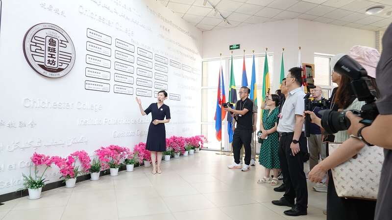 在鲁班工坊的实训基地,嘉宾们参观了智能制造、工业机器人等实训室。外国嘉宾还与中国学生同台操作激光打印机、机器人编程设备,体验了跨国合作的教学成果。
