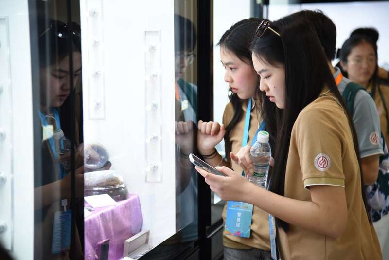 7月4日,参加第二十二届台胞青年千人夏令营的施同学姐妹在中山大学地质矿物博物馆参观。新华社记者 洪泽华 摄