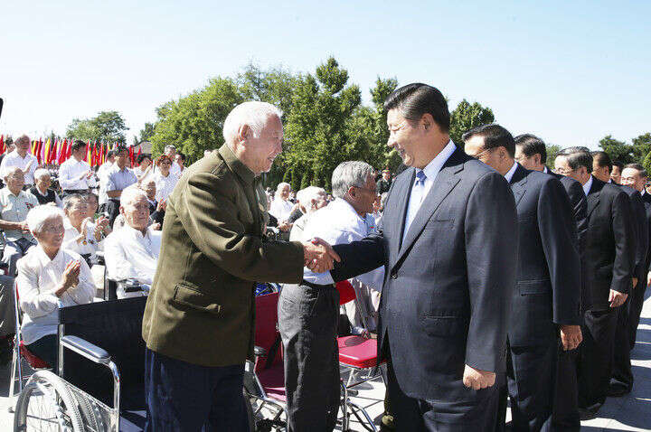 2014年7月7日,首都各界在中国人民抗日战争纪念馆隆重集会,纪念全民族抗战爆发77周年。习近平出席纪念仪式并发表重要讲话。这是参观结束后,习近平等亲切看望参加仪式的抗战老战士和老同志代表。