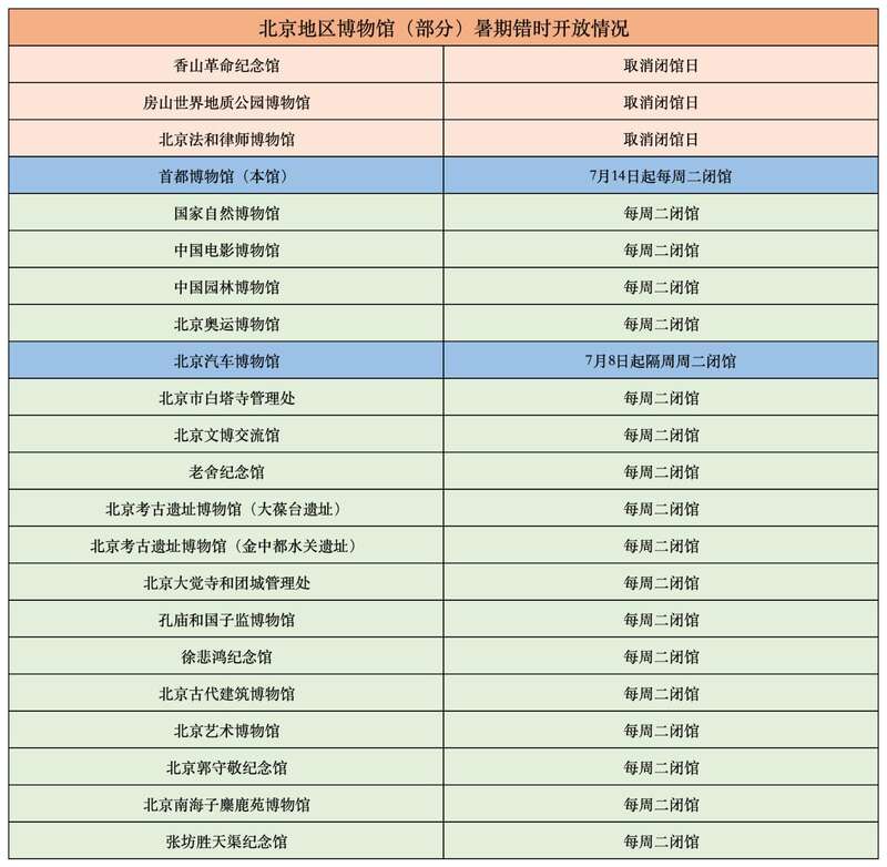 北京汽车博物馆、团城演武厅、北京考古遗址博物馆、北京市白塔寺管理处、北京郭守敬纪念馆、北京文博交流馆等多博物馆将闭馆日由周一调整为周二,同时延长开放时间。香山革命纪念馆、房山世界地质公园博物馆、北京法和律师博物馆暑期取消闭馆日。