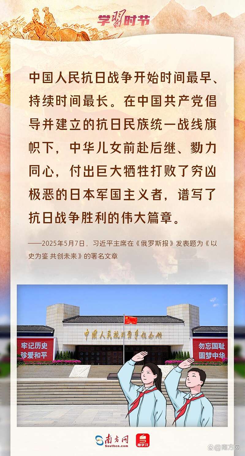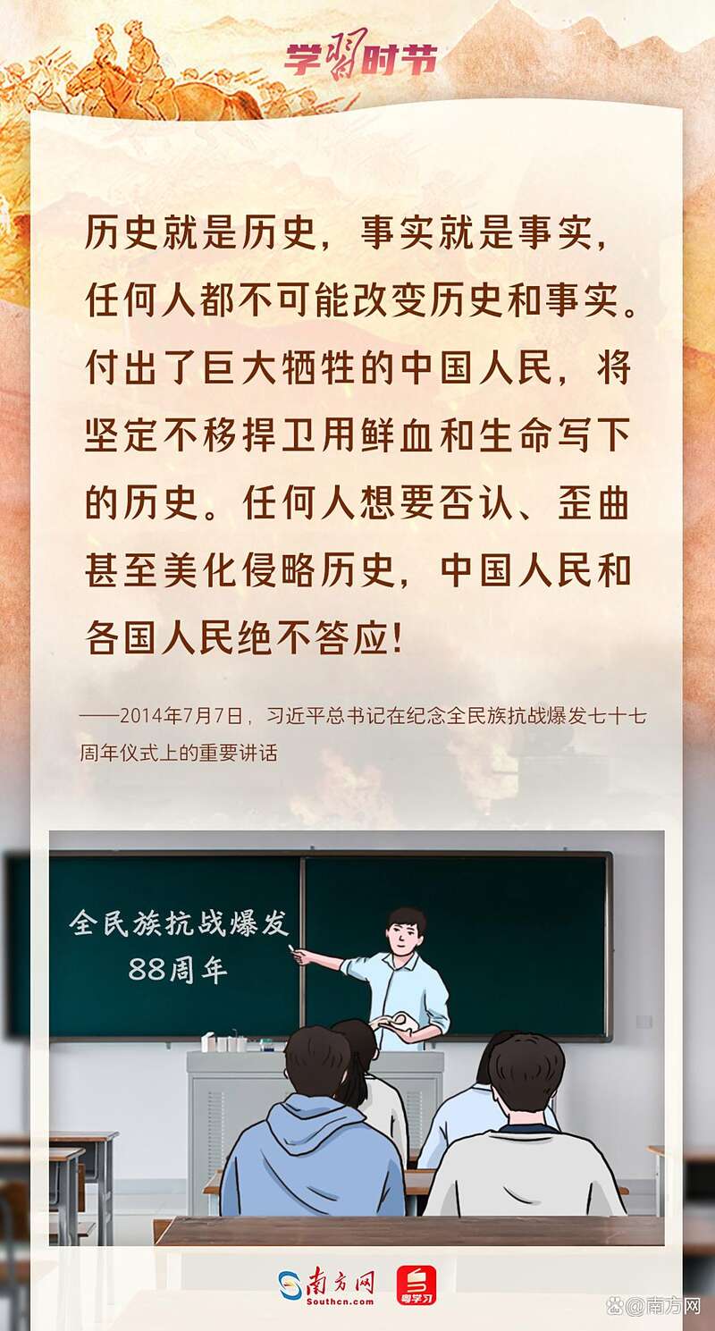 今年是全民族抗战爆发88周年,让我们一起重温习近平总书记关于中国人民抗战历史的铿锵话语,弘扬伟大抗战精神,激发为实现中华民族伟大复兴而奋斗的豪情壮志!