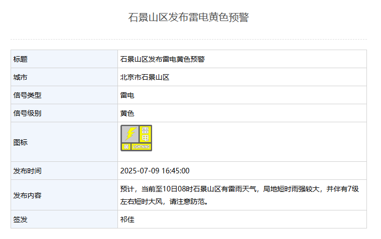 预计,当前至10日08时石景山区有雷雨天气,局地短时雨强较大,并伴有7级左右短时大风,请注意防范。