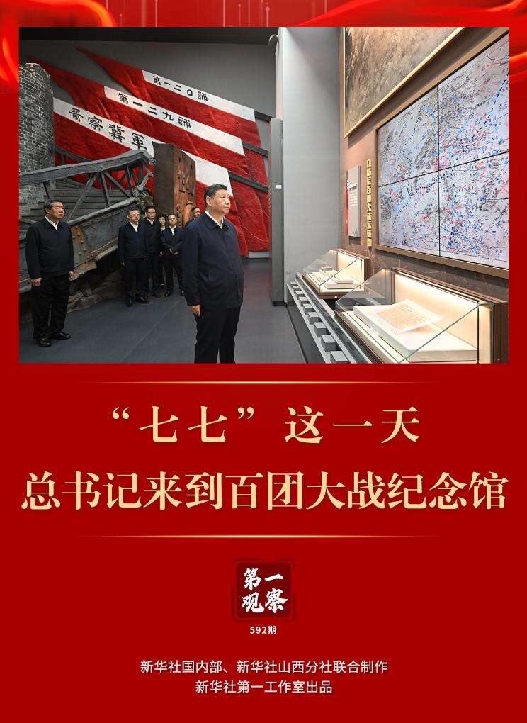 习近平总书记此次在参观百团大战纪念馆时,强调百团大战的历史壮举充分展现了我们党在全民族抗战中的中流砥柱作用,要求讲好抗战故事,把伟大抗战精神一代代传下去。在纪念抗战胜利80周年的重要时刻,总书记此行传递出铭记历史、缅怀先烈、珍爱和平、开创未来的决心和意志。