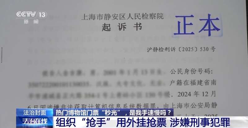 一方面是官方票被秒光,另一方面是网络平台上在出售高价票。针对这些异常情况,博物馆的工作人员向警方报了案,警方循线追踪,于2024年12月在福建厦门抓获了抢票团伙人员金某、兰某、何某等人,同时对涉案的上海某旅行社经营者赵某、张某等人采取刑事强制措施。