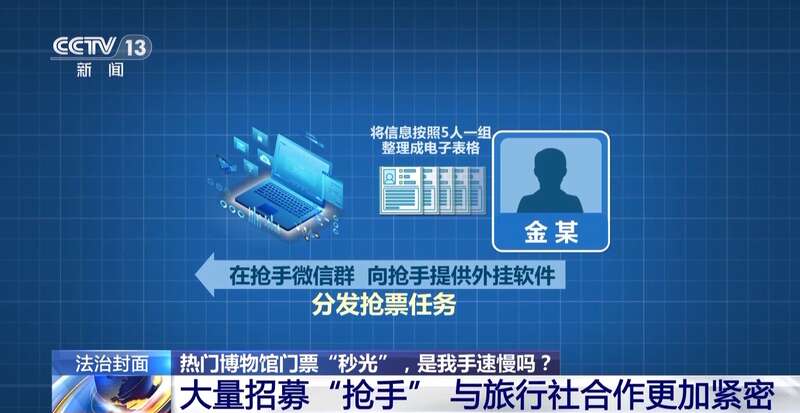 具体流程是旅行社在网上接到游客的订单后,将游客的姓名、身份证等购票消息,发送给金某。金某将这些信息按照5人一组的方式整理成电子表格,之后金某在抢手微信群,向抢手提供外挂软件,分发抢票任务。