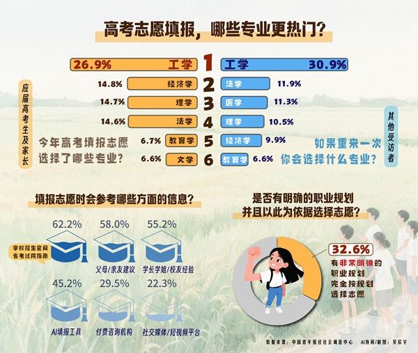 2025年各地高考志愿填报正在进行中。本周,中国青年报社社会调查中心联合问卷网(wenjuan.com),对1167名受访者进行的一项调查显示,在家有考生的受访者中,工学(26.9%)、经济学(14.8%)、理学(14.7%)是填报最多的3个专业大类。32.6%的受访考生家庭在填报高考志愿时有非常明确的职业规划,并以此为依据选择志愿。