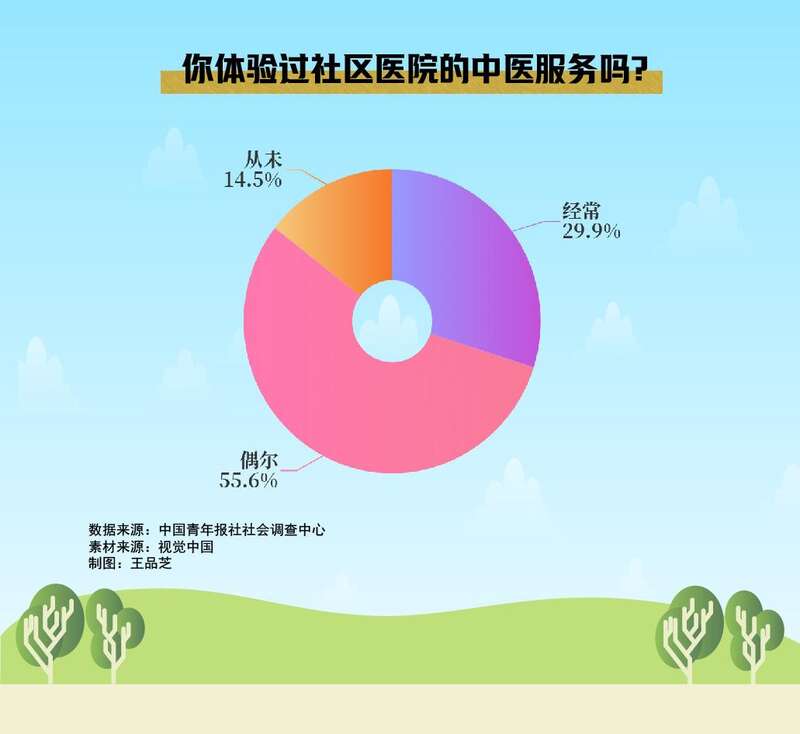 近日,中国青年报社社会调查中心联合问卷网(wenjuan.com),对1334名受访者进行的一项调查显示,85.5%的受访者体验过社区医院的中医服务,其中,29.9%的受访者经常体验。
