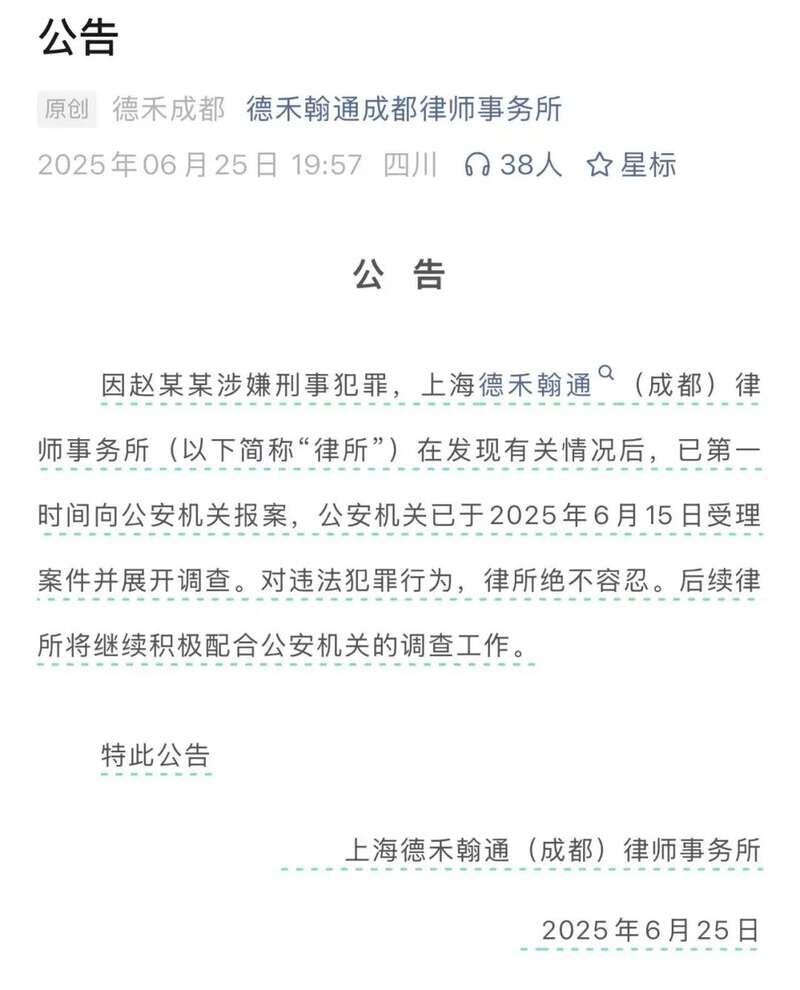 6月25日,上海德禾翰通(成都)律师事务所发布公告称,因赵某某涉嫌刑事犯罪,该律所发现有关情况后,已第一时间向公安机关报案,公安机关已于6月15日受理案件并展开调查。