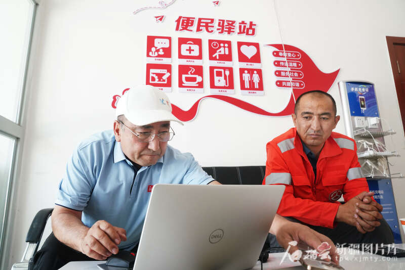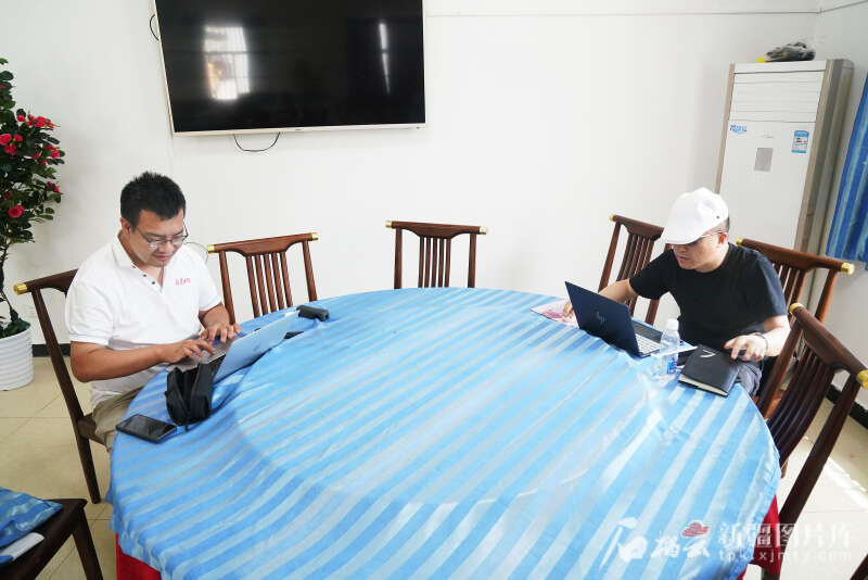 7月1日,在喀什公路事业发展中心疏附养护所盖孜养护站,记者马晋轩(左)和王永飞利用午餐时间准备稿件。