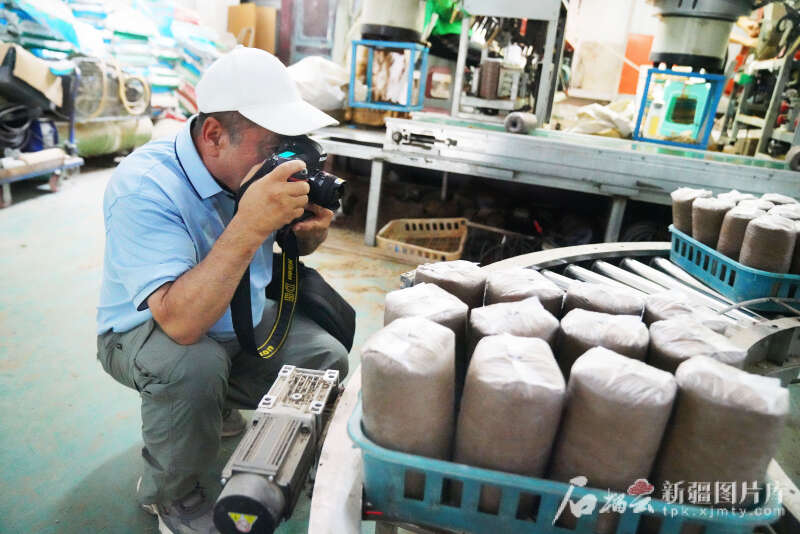 6月30日,在疏勒县“鲁疆情”食用菌生态科技示范园里,摄影记者约提克尔·尼加提在生产车间拍摄。
