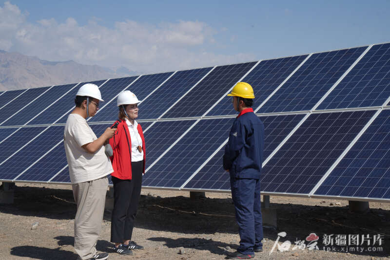 7月3日,在深能福塔光伏电站,记者拍热扎提·阿不都(中)和马晋轩(左)了解电站惠及塔什库尔干塔吉克自治县百姓的故事。