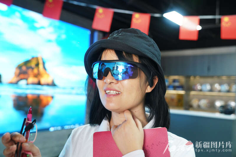 6月30日,在喀什综合保税区全球贸易通新疆喀什中亚出口商品选品中心,记者王娜体验了一款出口的智能眼镜,该眼镜可随机翻译一百多种语言。