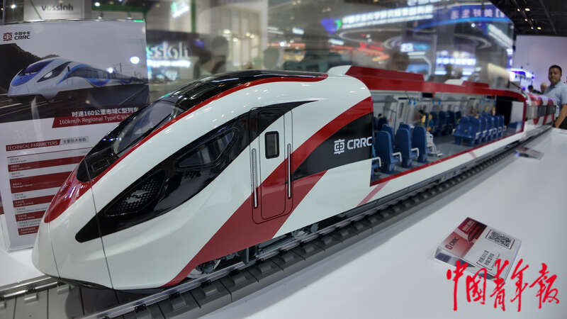 7月8日,第十七届中国国际现代化铁路技术装备展览会,中国中车展台上展示时速160公里市域C型列车。中青报·中青网见习记者 陈思阳/摄